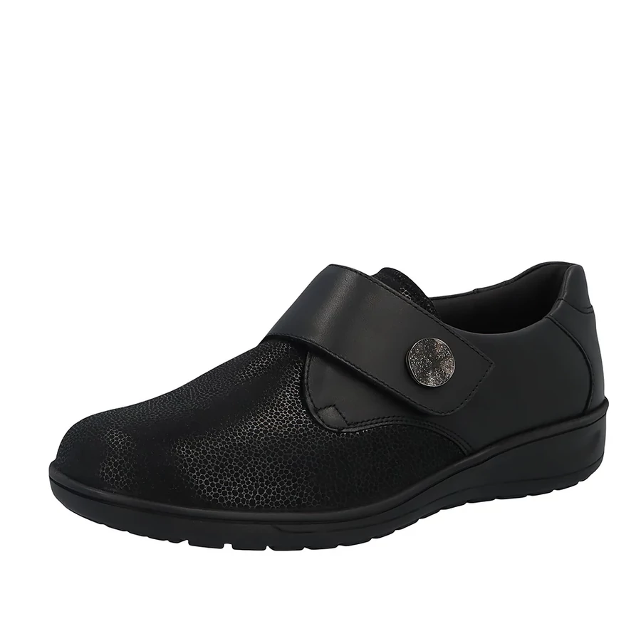 Ez a kényelmi cipő széles lábra nem a csillogásról szól – hanem arról, hogy te jól érezd magad benne. A fekete bőr és a rugalmas sztreccs anyag együtt tartós és praktikus választás, miközben finoman nőies marad. A széles tépőzáras pánt biztosan tart, gyorsan állítható, és még egy apró gombdísz is feldobja a megjelenését.