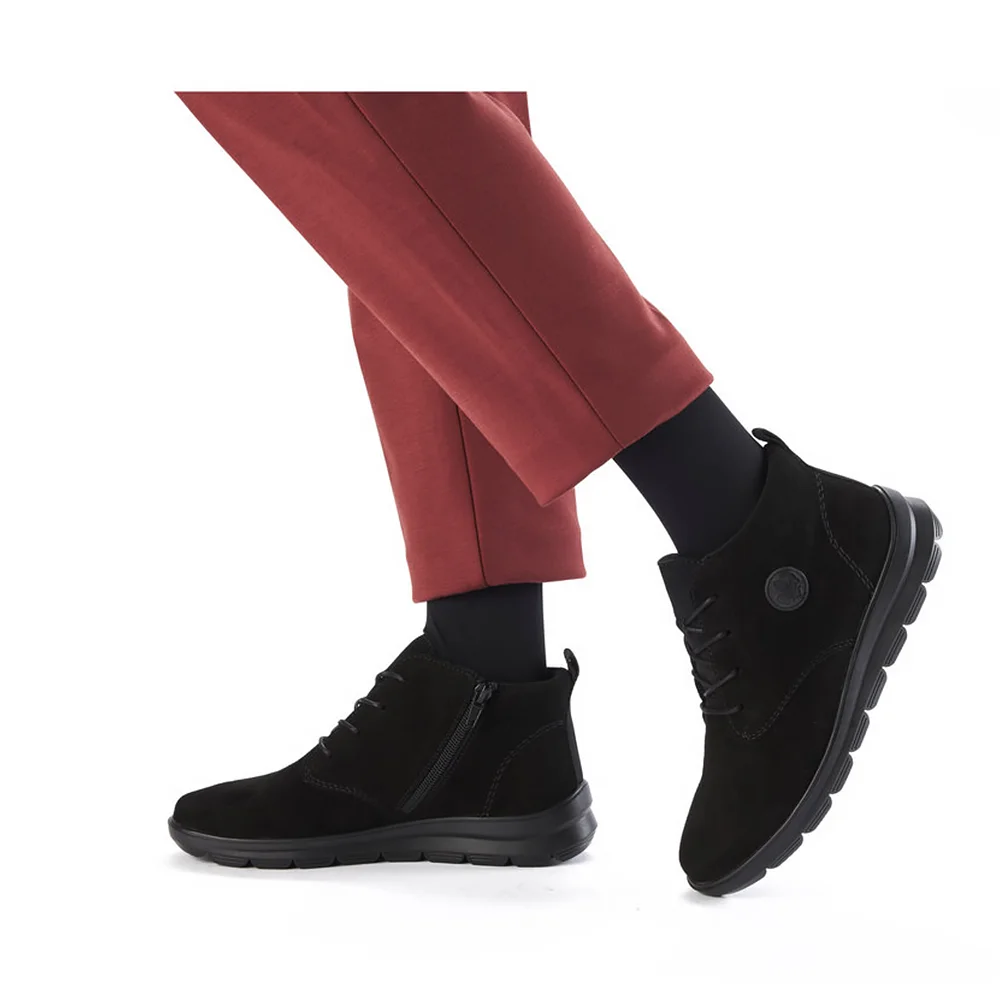 A nubuk bőr felsőrész és a visszafogott dizájn együtt a Rieker márka elegáns egyszerűségét tükrözik.