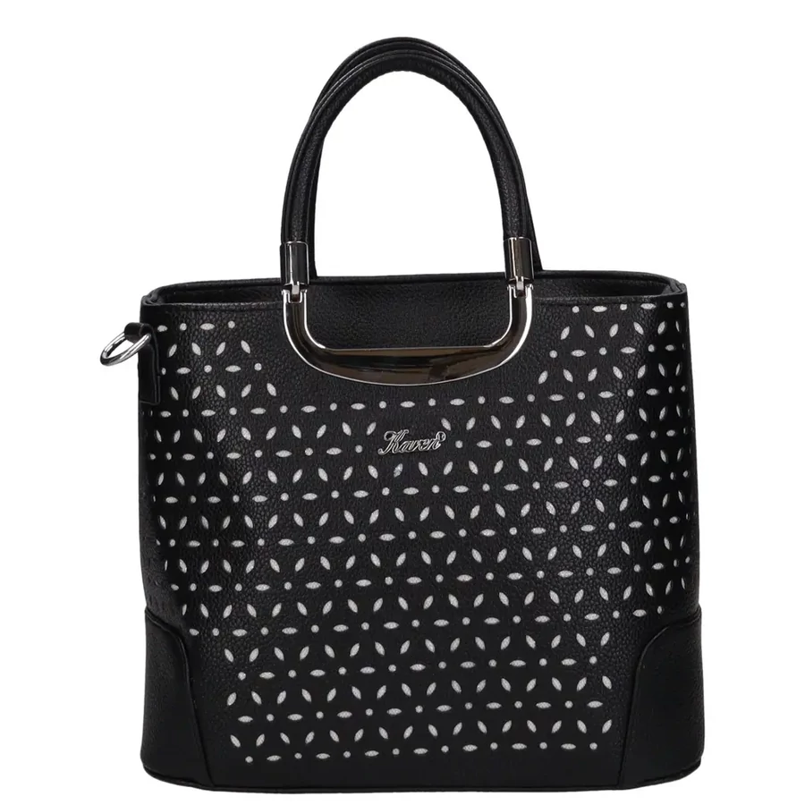 Stílus: Modern, elegáns kézitáska – hétköznapokra és alkalmakra is Elülső rész: Látványos mintázat és ezüst díszítés a stílusos Hátul: Praktikus cipzáras zseb a gyorsan elérhető tárgyaknak Belső kialakítás: Cipzáras, osztott belső tér. Rendezhetőség: Középső elválasztóval, mobiltartóval és egy cipzáras zsebbel a praktikus tároláshoz.